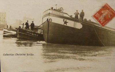 Un groupe de bateaux sur la Seine dans un endroit inconnu . Deux bateaux identifiés le BOURGOGNE et ALFRED