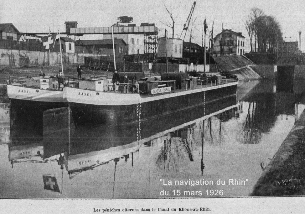 "La navigation du Rhin", dans son numéro du 15 mars 1926, consacre un petit article à deux péniches-citernes tractionnées construites sur le chantier suisse Werft BUSS A.G. à Augst pour la Société Bâloise de Navigation Rhénane (en allemand Basler Rheinschiffahrt Aktiengesellschaft, plus connue comme BRAG) et destinées à naviguer sur le canal du Rhône au Rhin entre Bâle et Strasbourg.