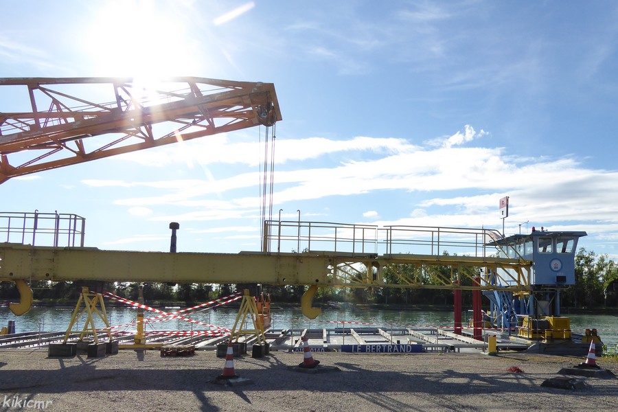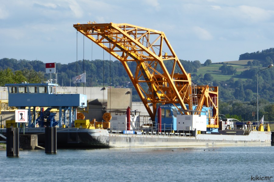 Un ponton-grue d'EDF, utilisé sur le Grand Canal d'Alsace, photographié au-dessus de l'écluse d'Ottmarsheim en août 2014 :