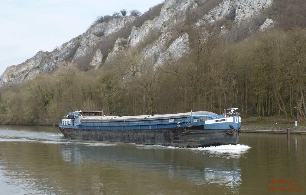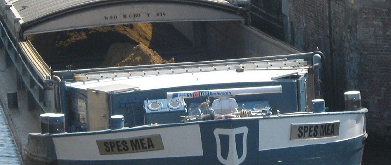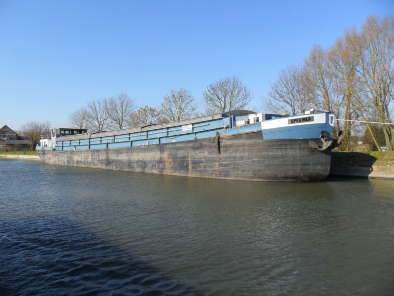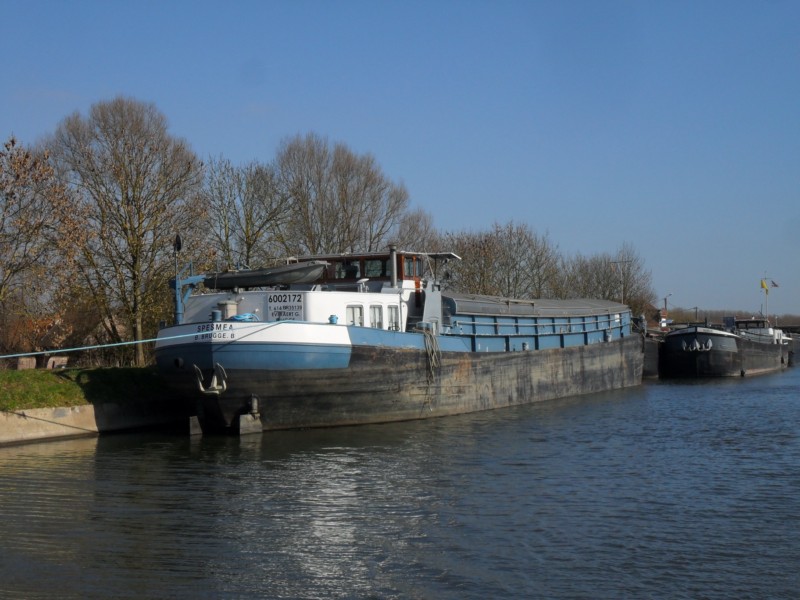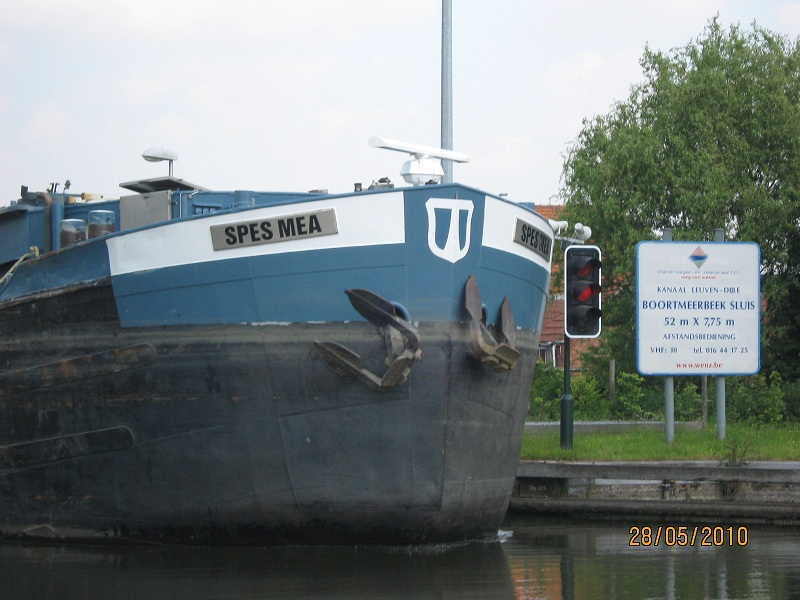 Quand on parle du loup on voit sa queue ... ou du moins son étrave. Au pont de Boortmeerbeeck avant l'écluse le SPES MEA, ex Sirona