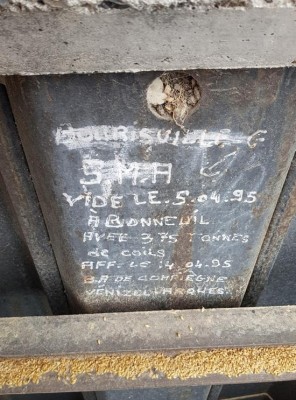 - la palplanche que j'ai gardée pour la fin nous ramène en 1995 ; celle-là, je pense qu'elle devrait être découpée et mise au musée ! Il a fait fort, Gégé, avec un graff on ne peut plus détaillé ! G. Bourisville, bateau SMA, a vidé le 5 avril 1995 375t de coils à Bonneuil, et s'est affrété le 14 avril 1995 au bureau d'affrètement de Compiègne pour un Vénizel - Arques ; je déduis, vu la destination, qu'il s'agissait de sable de verrerie :