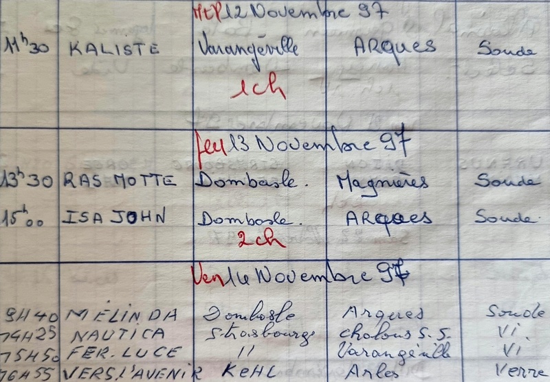 Et j'ai retrouvé le voyage en recherchant dans les registres de l'écluse de Varangéville, les 10 et 13 novembre 1997 : retour à vide pour charger de la soude à Dombasle, le premier pour Masnières, le second pour Arques :