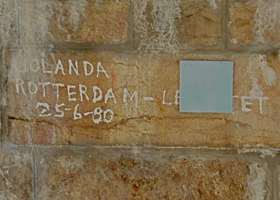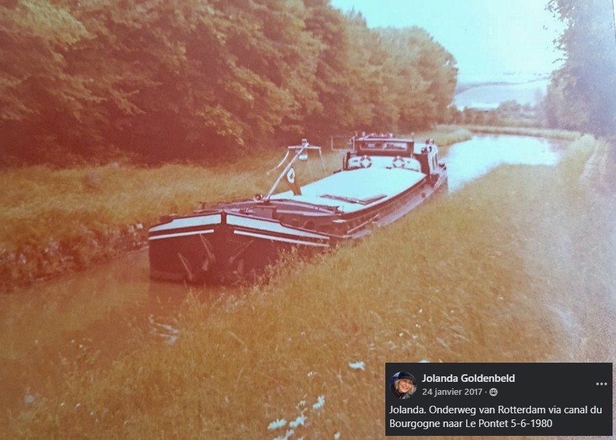 La légende est claire : « JOLANDA en route de Rotterdam au Pontet via le canal de Bourgogne 5-6-1980 ». La photo a été prise dans la tranchée de Creusot d'après un commentaire de Leigh (l'Auxerrois), c'est à moins de 700 mètres de là où le mot a été écrit sous le pont ! On est à l'amont de l'écluse 13 versant Yonne de Pont-Royal. Bon, alors bien sûr il y a un problème dans la date : il n'a vraisemblablement pas fallu vingt jours pour parcourir cette distance, c'est peut-être une faute de frappe sur Facebook...