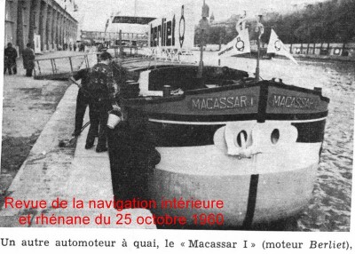 Et un peu plus loin : "Le 11 octobre également, M. Émile Parfait, président-directeur général de Berliet, avait convoqué quelques 400 invités à visiter l'automoteur MACASSAR 1, accosté au droit du hall Suffren et dont la cale avait été remarquablement adaptée en salon de réception revêtu de tapis et décoré de reproductions photographiques fort bien choisies : à tribord, la navigation intérieure au cours des âges, en commençant par l'ancienne Égypte, à bâbord la navigation fluviale contemporaine. En bout de cale, sous la timonerie, on pouvait voir le groupe marin Berliet 140cv 6 cylindres (...) dont on a pu apprécier le silence de fonctionnement".