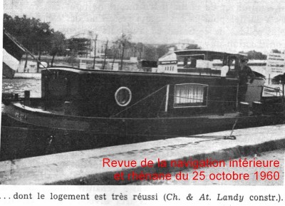 Photo extraite du numéro du 25 octobre 1960 de la Revue de la Navigation intérieure et rhénane, avec quelques lignes à sont sujet : "Le MACASSAR 1 (...) constitue d'ailleurs un bel exemple de l'effort de modernisation poursuivi poursuivi par l'artisanat, en même temps que de l'efficience des Chantiers et Ateliers Léon Landy qui, en un temps record, ont fait d'un bateau tractionné un automoteur de fort belle allure."