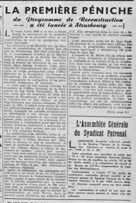 En effet, c'est dans le numéro de mai 1948 de la Navigation du Rhin - Revue de la Navigation intérieure que l'on trouve un article sur un événement très important pour la batellerie de l'époque : il s'agit du lancement, le 3 mai 1948, à Strasbourg, du premier bateau construit pour la Société pour la Reconstruction du Parc Fluvial (SRPF), numéro un d'une très longue série. Il porte le numéro SRPF 1, et il est précisé qu'il fera carrière sous la devise SAINT-NICOLAS. Voici la publication en question (agrandir pour lire) :