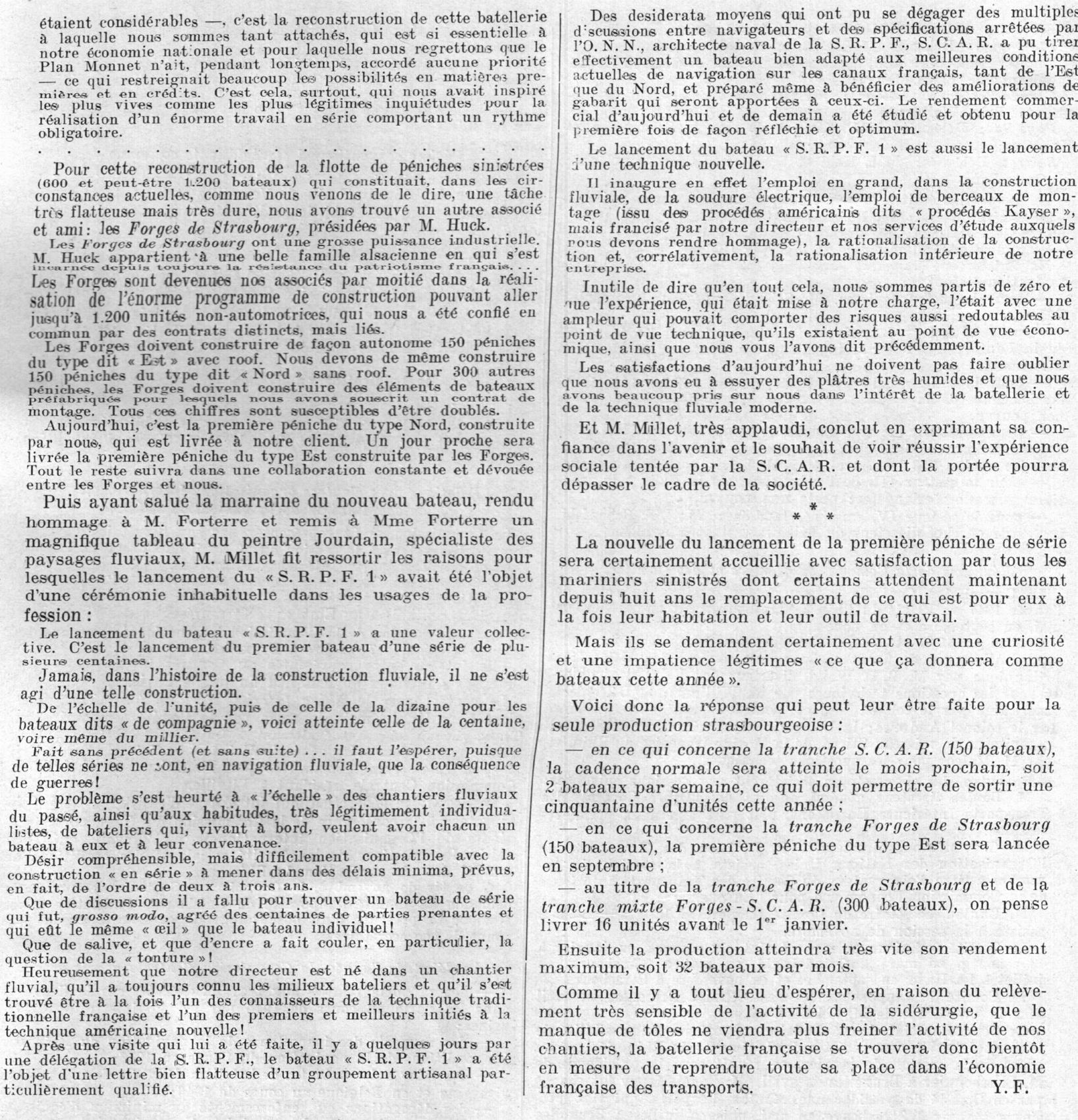 En effet, c'est dans le numéro de mai 1948 de la Navigation du Rhin - Revue de la Navigation intérieure que l'on trouve un article sur un événement très important pour la batellerie de l'époque : il s'agit du lancement, le 3 mai 1948, à Strasbourg, du premier bateau construit pour la Société pour la Reconstruction du Parc Fluvial (SRPF), numéro un d'une très longue série. Il porte le numéro SRPF 1, et il est précisé qu'il fera carrière sous la devise SAINT-NICOLAS. Voici la publication en question (agrandir pour lire) :