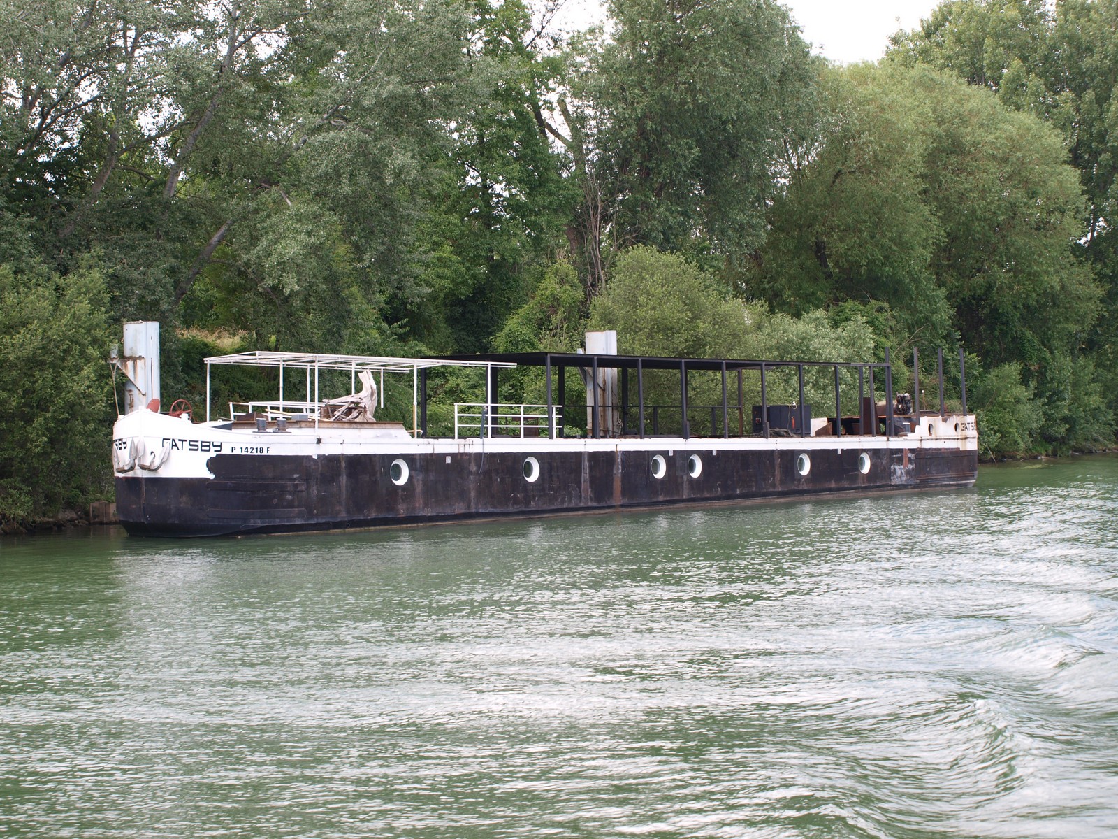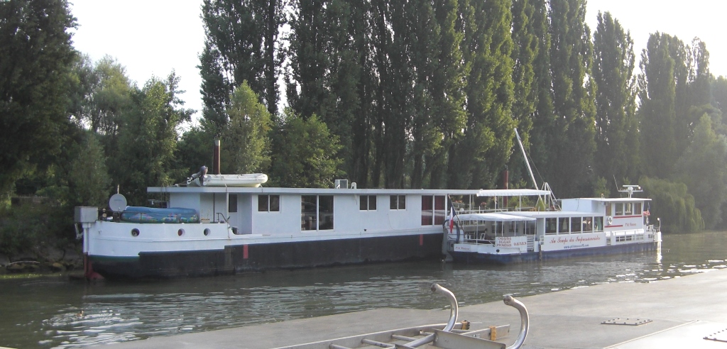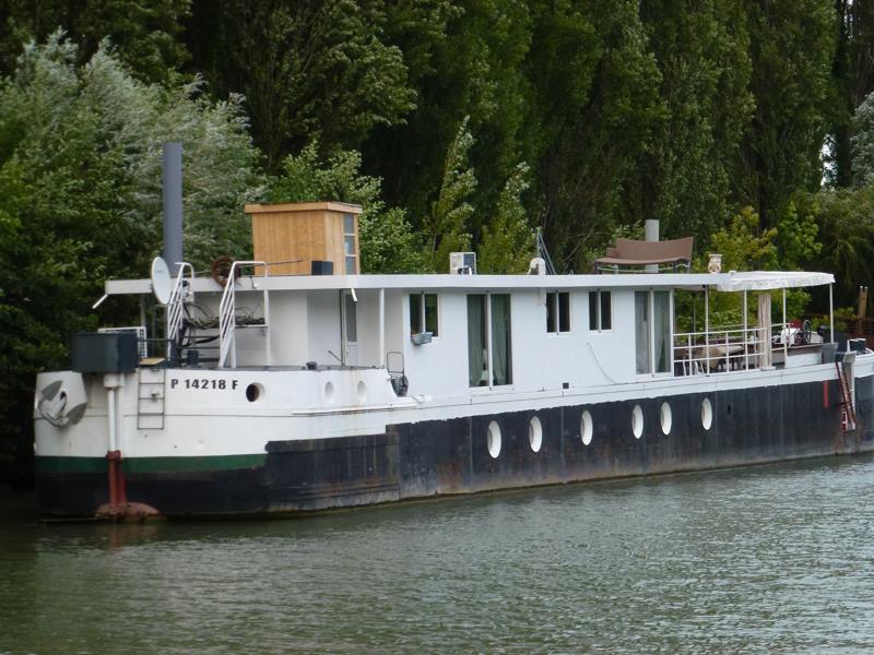Tiens ! Encore un bateau-logement de l'Oise qui n'est pas sur le forum ! Celui-là est quelque part entre Pontoise et l'Isle-Adam, et ressemble fort à un Strasbourg ; la devise est magnifique, ainsi que le matricule, bien peints, bien lisibles :