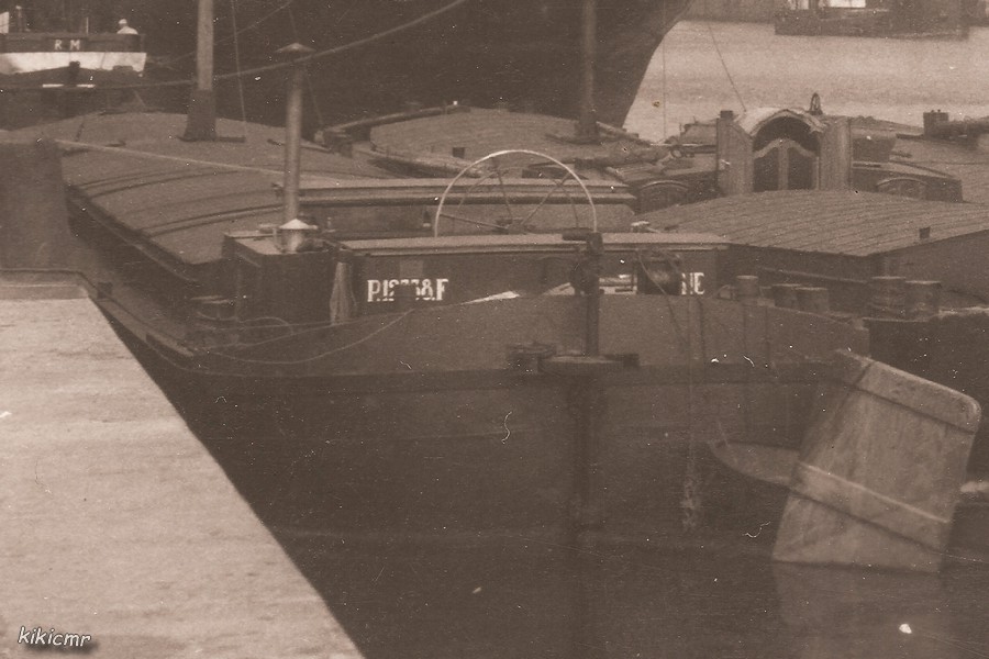 Plusieurs bateaux visibles, intéressons-nous ici au premier à quai : une construction des Forges de Strasbourg, sans dunette mais avec un bloc devant la marquise. A l'arrière de celle-ci est peint le matricule, mais le petit bollard en masque deux chiffres : on lit clairement P12**8F, je pense que c'est même plus précisément P12*38F et je serais presque prêt à parier, d'après le peu qu'on arrive à déchiffrer, que c'est P12338F. Et la devise aussi est cachée, elle finit par un E et l'avant-dernière lettre se compose de deux barres verticales (dans un premier temps, j'avais pensé à un N) :