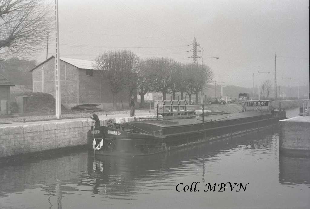 M. Vadot, l'ingénieur en chef des Ponts et Chaussées, disparaît dans les profondeurs du « Fortier 31 », le temps d'examiner l'emplacement des soutes, l'espace d'une minute. Il émerge bientôt à l'échelle de coupée précédent l'armateur, M. Luc Fortier, directeur de la Compagnie Fluviale qui porte son nom. Tout le monde est maintenant sur le pont : l'abbé Collignon ; la marraine de la péniche, Mme Fortier ; l'armateur et ses associés ; le capitaine du bateau, M. Pezet, impressionnant dans son pull-over bleu à col roulé, un vieux bourlingueur des rivières ; M. Courtaut, terrien aujourd'hui par la force des choses ; des employés de la maison, des invités, un photographe et un cinéaste (honni soit qui mal y pense) pour compléter ce très exceptionnel et très brillant équipage...