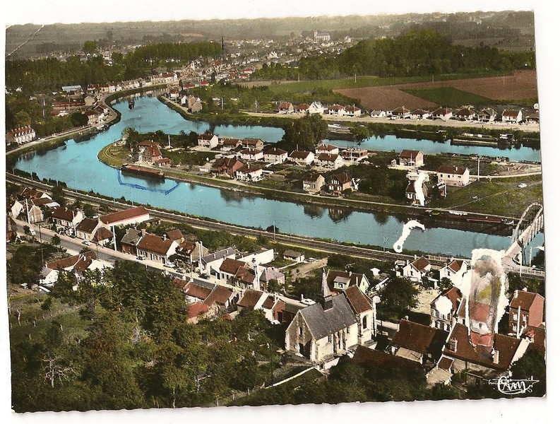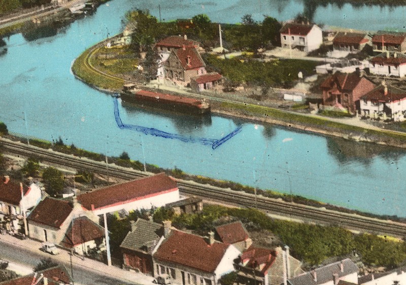 J'ais retrouve une carte postale de Lisle Jean Lenoble a Janville ( L'ile aux snobs comme je l'appelais ! )d'epoque 1964 / 65 , la 1ere nouvelle ecluse est en construction et on voit la grue sur le chantier ... mais d'autre part on voit aussi le Claude a sa place habituelle amarre en face de la maison ... la devise "Claude" sur les fargues en jaune pale et lettres style Coca Cola mais pas evident sur cette photo vue d'avion ...