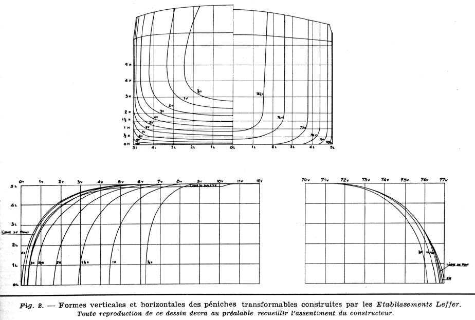 Retour en arrière par rapport au dernier article repris ci-dessus ; cette fois, c'est dans le numéro du 10 mai 1956 de la Revue de la navigation intérieure et rhénane, un article de H. de Goriainoff, ingénieur civil du Génie maritime : "Le renouvellement du Parc fluvial français". Il y est question de la péniche transformable du Renouvellement, avec les séries Forges de Strasbourg et Leffer :