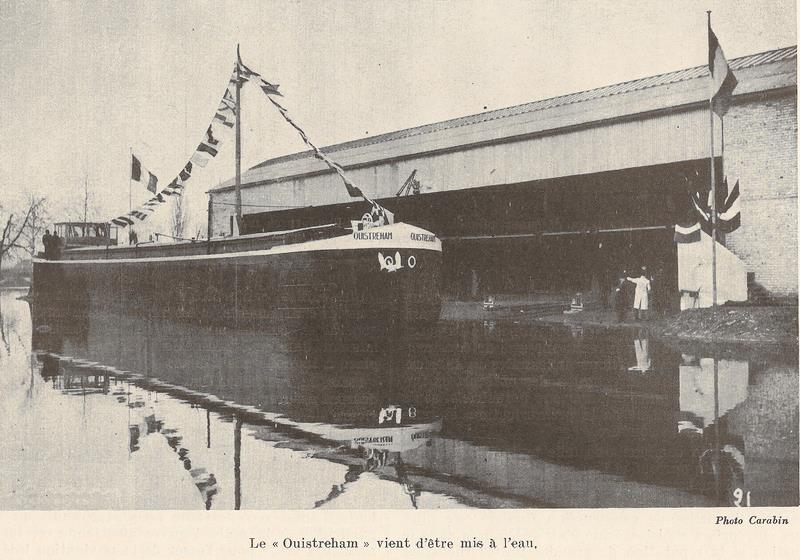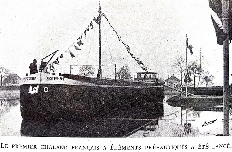 OUISTREHAM a été mis à l'eau au chantier du Wacken à l'occasion de l'inauguration de la chaîne de préfabrication de péniches des Forges de Strasbourg ; sa marraine est Madame Villard, épouse du président de la Société pour la Reconstruction et le Renouvellement du Parc Fluvial (SRPF) :