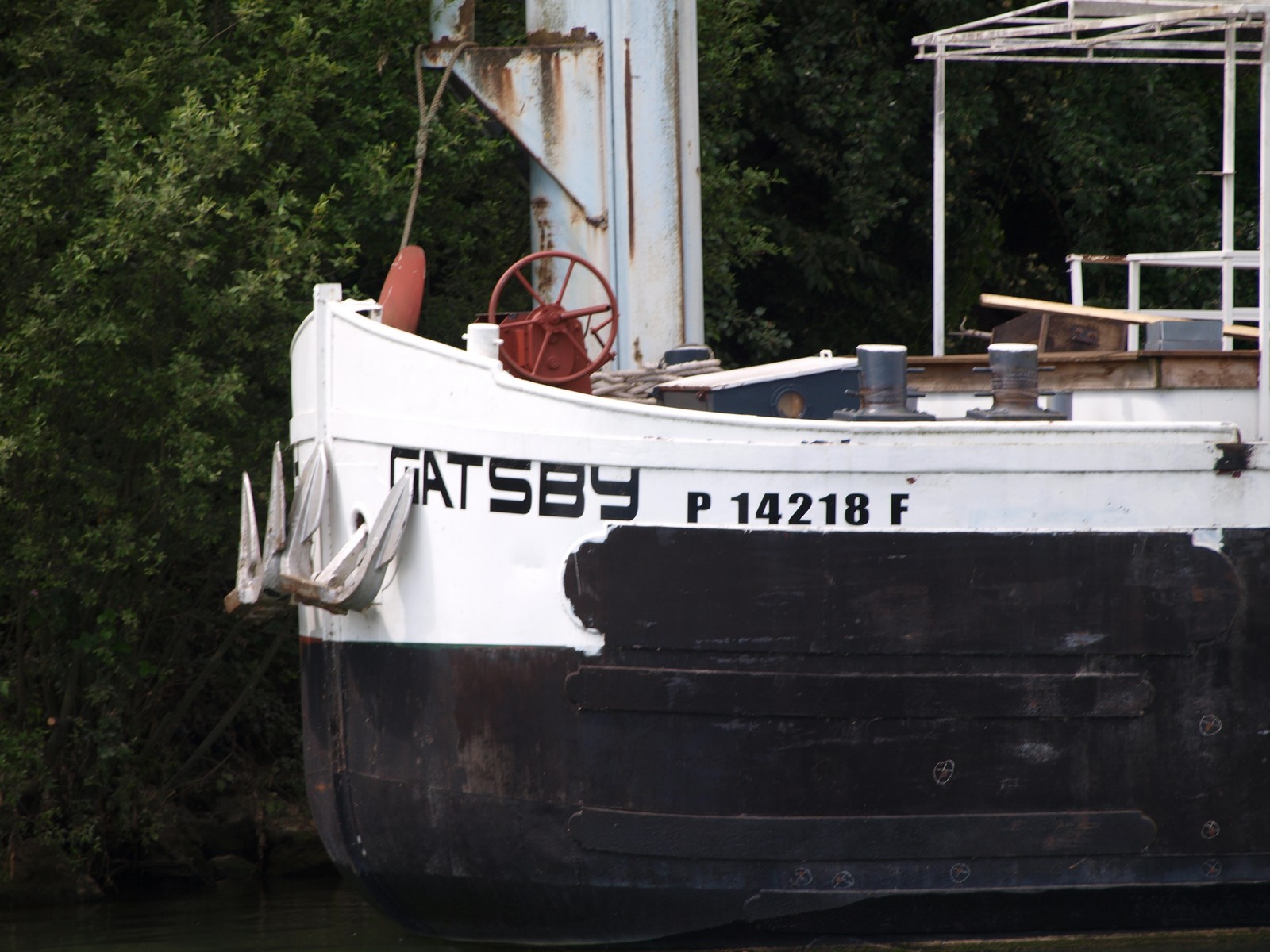 Tiens ! Encore un bateau-logement de l'Oise qui n'est pas sur le forum ! Celui-là est quelque part entre Pontoise et l'Isle-Adam, et ressemble fort à un Strasbourg ; la devise est magnifique, ainsi que le matricule, bien peints, bien lisibles :