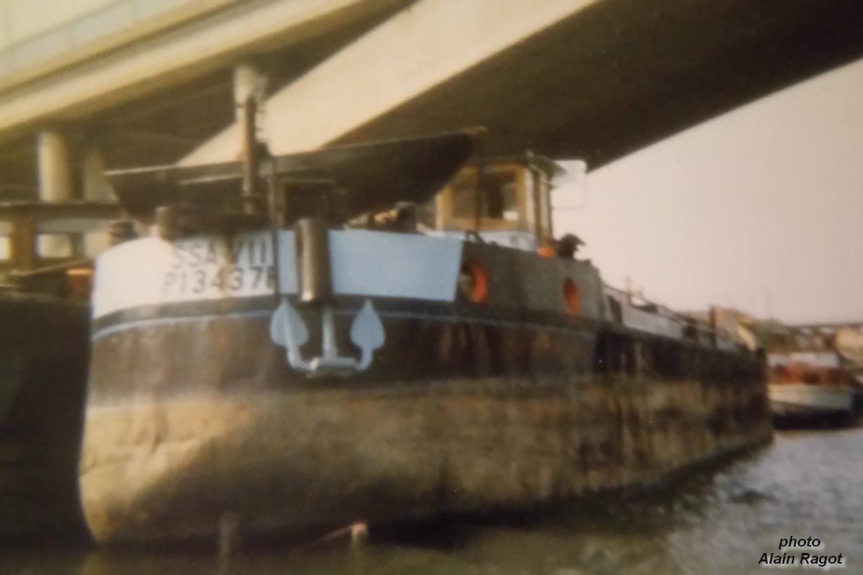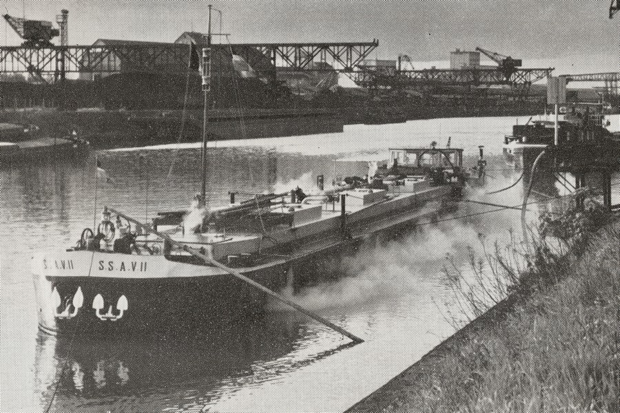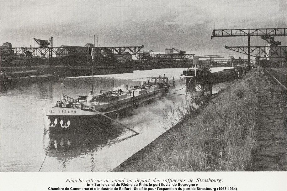 Une photo extraite de la publication « Sur le canal du Rhône au Rhin, le port fluvial de Bourogne - Etudes de trafics, esquisses d'organisation », de la Chambre de Commerce et d'Industrie de Belfort et de la Société pour l'expansion du port de Strasbourg et de son hinterland (1963-1964), sur laquelle on voit un bateau de la Société Strasbourgeoise d'Armement :