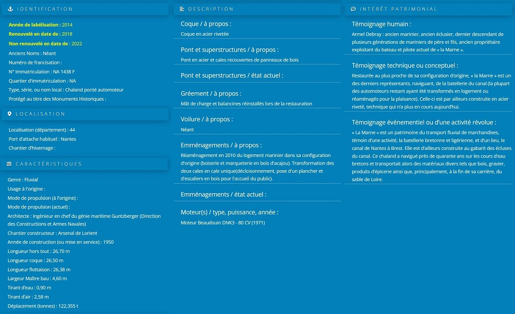 LA MARNE - NA1438F - a été labellisé PATRIMOINE MARITIME ET FLUVIAL en 2014, renouvelé en 2018 et non renouvelé en 2022.