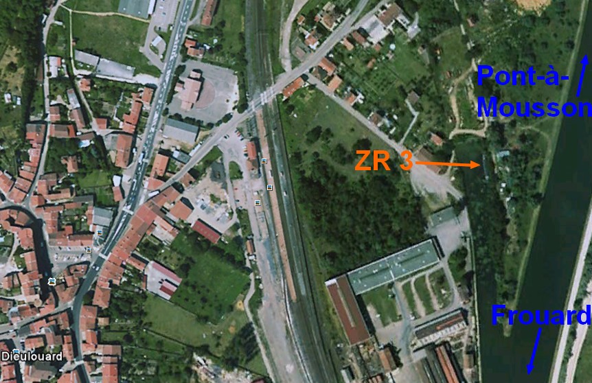 C'est à Dieulouard, entre Frouard et Pont-à-Mousson. Aujourd'hui, à ce niveau, les bateaux circulent sur une dérivation à grand gabarit, mais il reste l'embranchement de l'ancien canal latéral. Le ZR3 est amarré là, juste devant le canal remblayé, derrière l'usine Gouvy.