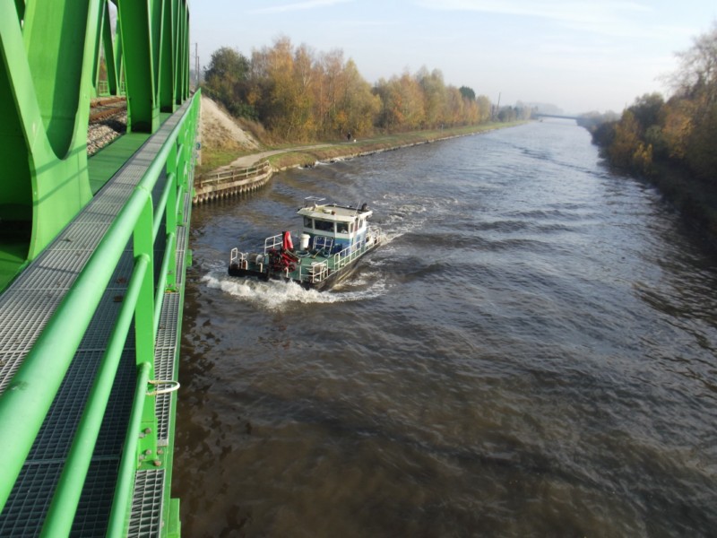 caractéristiques de celui-là : 13m de long, large de 5m à l'avant et 3,80m à l'arrière, tirant d'eau de 1,20m à 1,48m, tirant d'air de 3,20m pour un poids de 34t et une vitesse de pointe de 18km/h