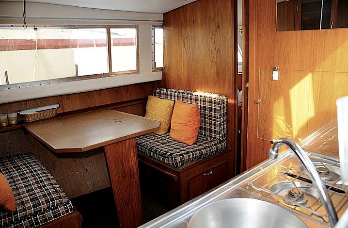 -Deux pièces séparées, dont un carré comprenant une cuisine equipée de plaque de cuisson a gaz, frigo 12V/220V, evier eau chaude et froide, et nombreux rangement. Comme souvent ce carré comprend une table pour 4 personnes transformable en lit double.