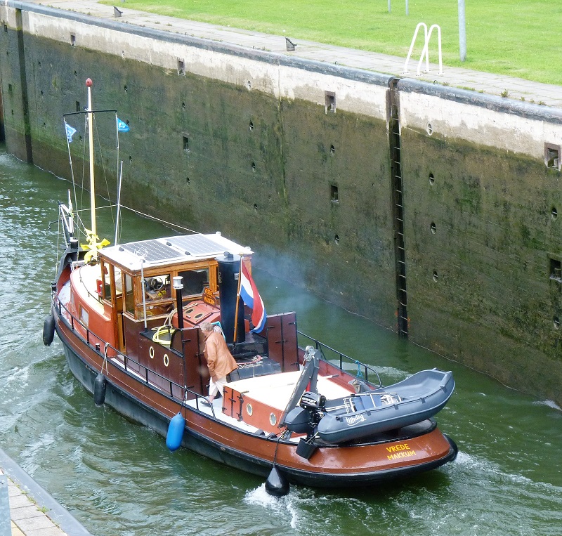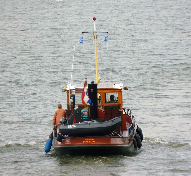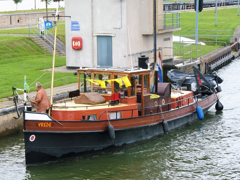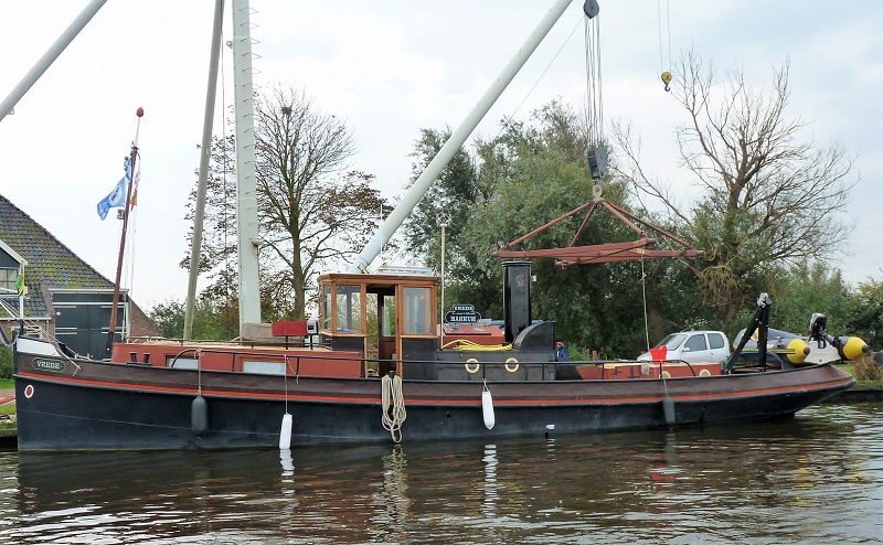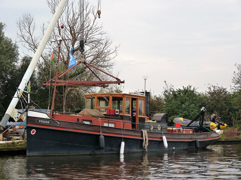 Vrede , 15,20 x 3,68 x 1,50 , Bouwjaar 1929 , Werf Lemaire & Zn. in Hoboken ( België ) , 1 x 8 cilinder Kromhout nr.13954 8-GSV 1954 inbouw 2003 vermogen 80 apk. = 59 kW. bij 1000 r.p.m. , ex 7-07-1929 Ernest/E.de Laet in Antwerpen , ex 28-08-1939 Vrede/L.de Meyer in Antwerpen , ex 19?? Vrede/C.de Meyer in Antwerpen , eigenaar L. van 't Wout in Makkum.