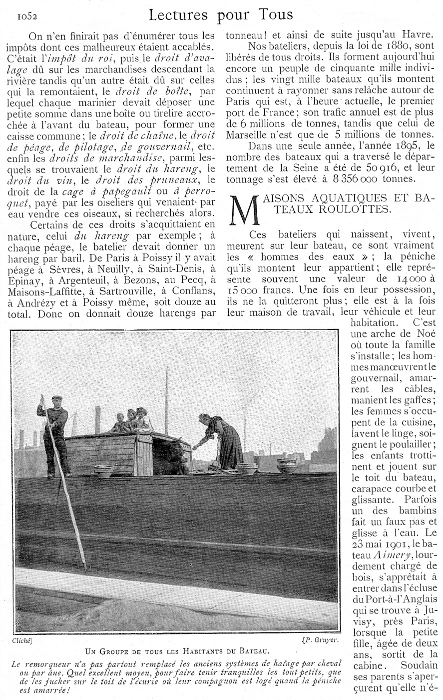 Un peu de lecture ce week-end, il s'agit d'un article paru dans la revue "Lecture pour tous" en 1903, sur la vie des mariniers à cette époque. L'occasion de voir un nouveau matricule : P629F, en troisième page, sur un bateau dont on n'a pas la devise, mais dont on peut lire qu'il appartient à Georges Letellier, 123 quai de Valmy (à Paris ?). Le plus ancien matricule de Paris dont on ait une trace ici...