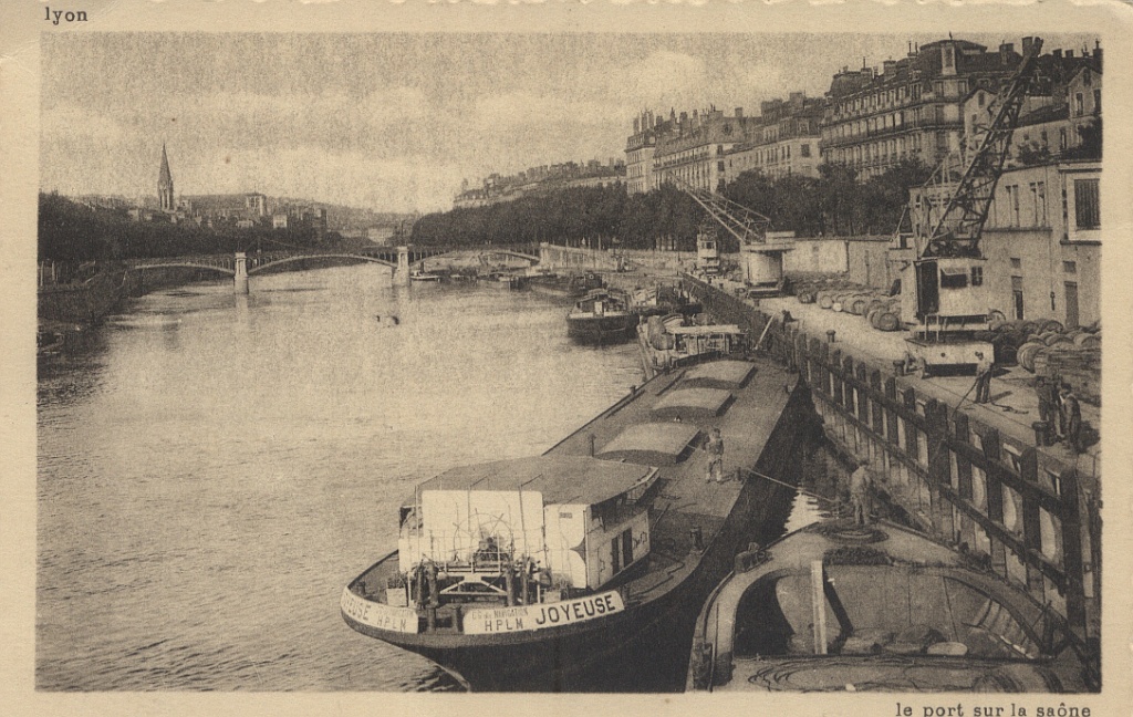 Voici une autre carte postale montrant un bel ensemble de bateaux sur la Saône à Lyon vers 1930