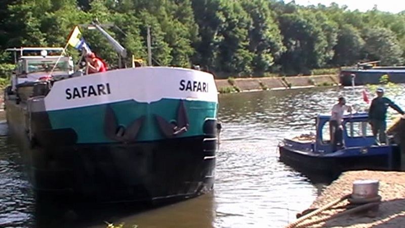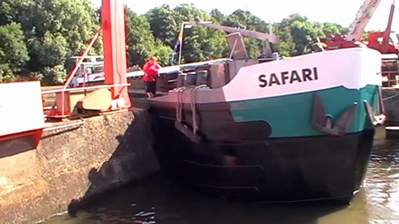 Donc , mais en 2 fois, la sortie du SAFARI de la cale sèche du chantier Vankerkoven à Pont-de-Loup .Il doit parfois attendre car il y a pas mal de passage sur la Sambre