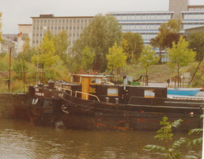 J`ai une photo très très mauvaise en ce qui concerne la THEA, qui est ici caché par l`EUROPA à l`ancien port de Saarbrücken, pris en 1988. Dans la photo originale je pense que je peux lire le IVR comme 04323510. On ne peut pas voir beaucoup. Quel que soit le cas: le cul est droit. Cependant, je ne vois pas de toit avant la timonerie.