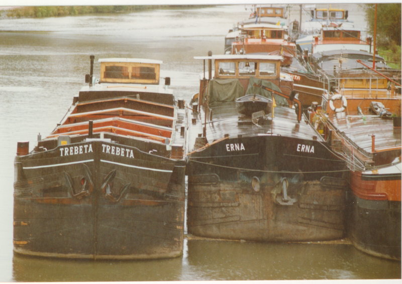 Il y a déjà une photo de cette groupe dans le sujet SYBILLE, pris à partir d'un point de vue contraire. Sur le premier photo, la peniche a droite est une inconnue. Au milieu le ERNA (ici dans le forum) et a gauche le TREBETA. Au milieu de la première photo à droite à l`avis de l`kimiol le VEGA (parce que cette peniche appartenait au frère du batélier du ARTA), a gauche ARTA. A l`arrière a droite EROS, a gauche SYBILLE (ici dans le forum).