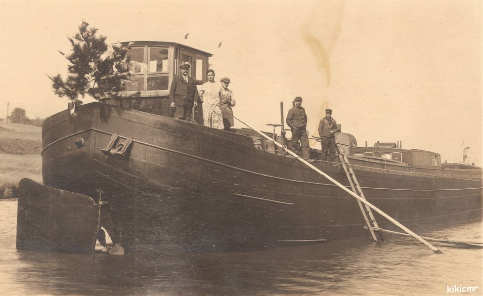 Hildesheim-Weissgerber. Inh. : K.C.Kirschmann. Saarbrücken 3, Bahnhofstrasse 21. Telefon 915. Un photographe de Sarrebruck ! Et la bordaille qui paraît fraîchement peinte, sans la trace du tirant d'eau ! Je me demande, du coup, si la photo n'a pas été prise au moment de la sortie de chantier du bateau ! C'est peut-être pour ça qu'il est décoré, avec un arbre à l'arrière, une sorte de couronne peut-être, et ce qui ressemble à des petits drapeaux aux angles de la marquise. C'est dommage que l'expéditeur ne l'a pas datée.