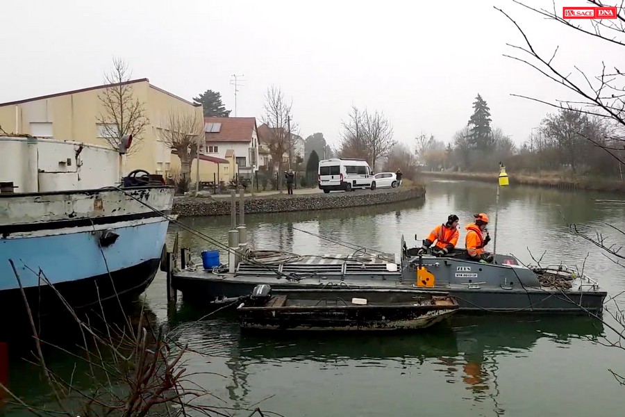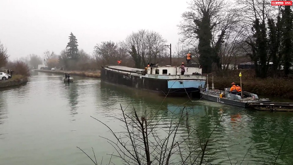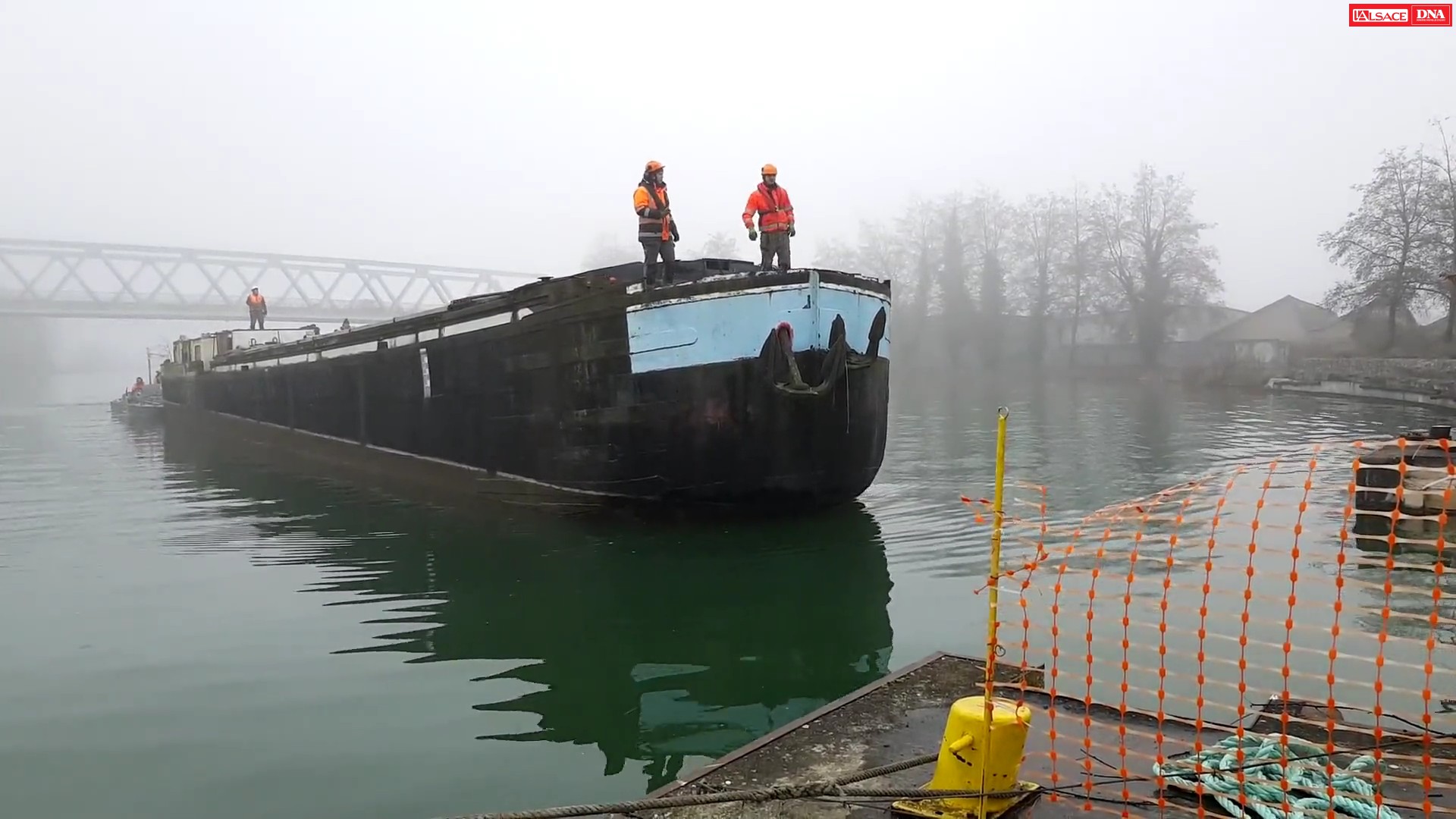 Et quelques captures d'écran d'une vidéo prise le 18 janvier 2022, sur lequel on voit la sortie du bateau du trou où il était amarré et l'entrée dans la cale du chantier de l'Île Napoléon, à Illzach (68), là où il va être déchiré :