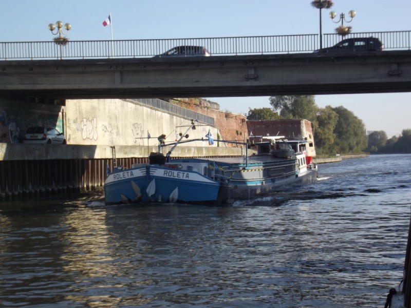 Et des photos pour illustrer le changement de devise : le canal du Nord étant en chômage, le voici aujourd'hui dans le canal de Saint-Quentin, sous la pluie, d'abord à l'amont de l'écluse de Banteux (59) puis à la voûte, derrière le toueur.