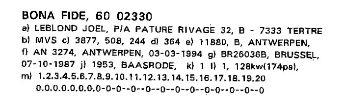 Bona Fide , 38,77 x 5,06 x 2,44 , 357 ton , Bouwjaar 1953 , Werf van Praet-Dansaert in Baasrode ( België ) , 350 pk GM , eigenaar J. Leblond in Tertre , ENI 06002330