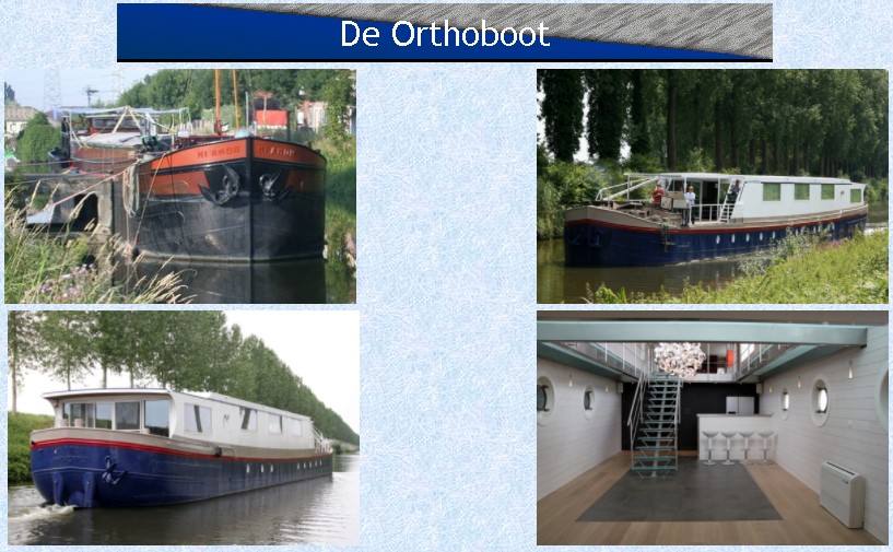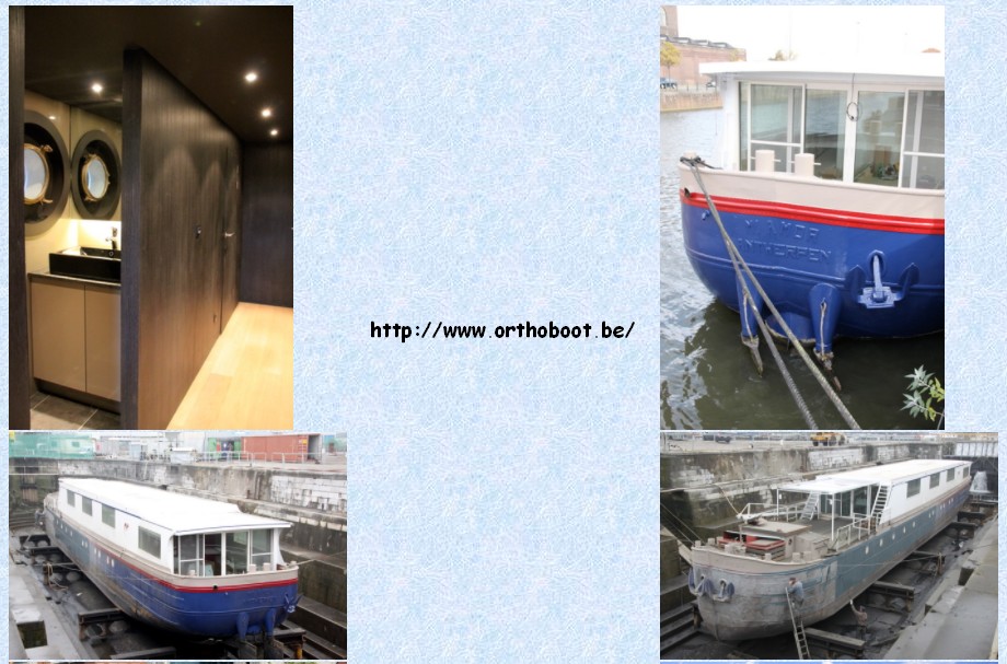 J'ai fait une recherche sur ce bateau dans le groupe Facebook "Spitsen typische binnenvaartschepen", ICI, où j'ai appris que ce bateau avait été transformé en cabinet médical par le Dr. Peter Roosen, à Eeklo (Belgique) (chirurgie orthopédique et traumatologie, spécialisation membre supérieur) ; et en plus, il a un site internet pour tout savoir, sur lequel on peut lire que le bateau a été construit en 1961. En voici quelques captures d'écran orthoboot.be :