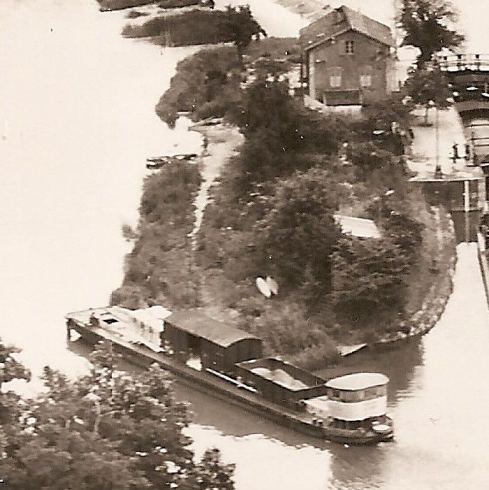 Voici une vue aérienne sur laquelle on voit la PAULINE en aval de l'écluse n°28 de la Sarre canalisée :