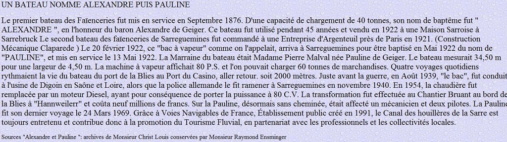 "En 1922, la direction de la faïencerie fait construire aux ateliers des "Constructions Mécaniques Claparède" à Argenteuil un nouvel automoteur, équipé d'une machine à vapeur. Ce bateau aura pour devise PAULINE, en hommage à Pauline Urzschneider, la fille de Paul Urzschneider (ancien dirigeant de la faïencerie).