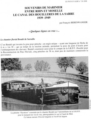 Notons aussi que le chantier Bendel de Sarralbe est aussi connu pour les très célèbres "grues de Sarralbe", qui ont équipé de nombreux bateaux. Elles furent fabriquées de 1900 à 1928, d'après René Descombes, dans son livre "Chevaux et gens de l'eau" :