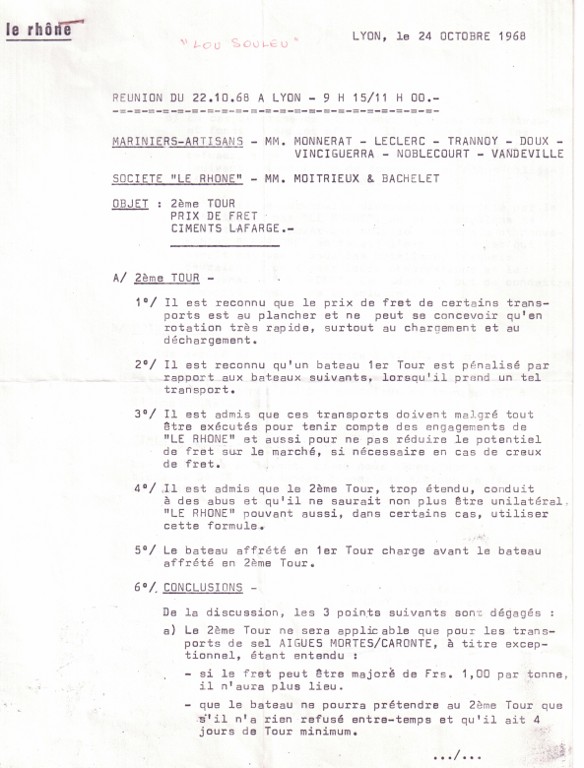 Il fut à l'origine de la création du groupement des <<MAITRES BATELIERS DU RHONE>>, et il lui fallut beaucoup de patience et de diplomatie pour rassembler et faire parler d'une seule voix, une dizaine de Patrons aux idées différentes !