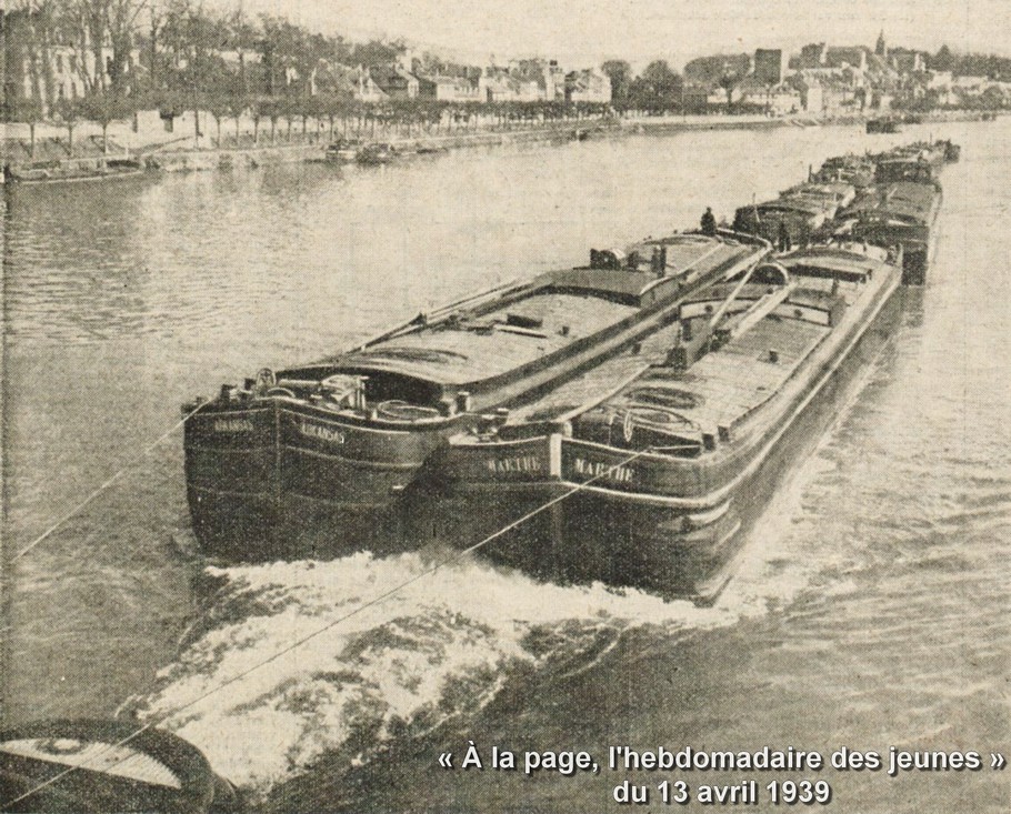 Dans la revue « À la page, l'hebdomadaire de jeunes » du 13 avril 1939, disponible sur Retronews, on trouve un article sur la batellerie française avec cette photo :