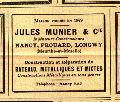 - chantiers Munier : probablement situés entre l'écluse double et Clévant ; on retrouve des traces de l'entreprise de chaudronnerie "Jules Munier" à Frouard après l'annexion de la Moselle ; la société sera amenée à se rapprocher de l'entreprise Delattre après la Première Guerre mondiale, qui existait encore dans les années 1950 en amont de l'écluse de Clévant