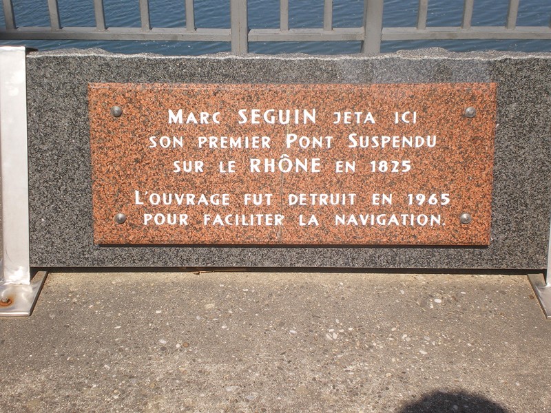 La plaque est posée à l'emplacement du premier pont de Marc Seguin sur le Rhône.