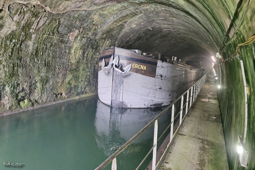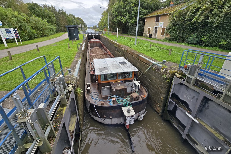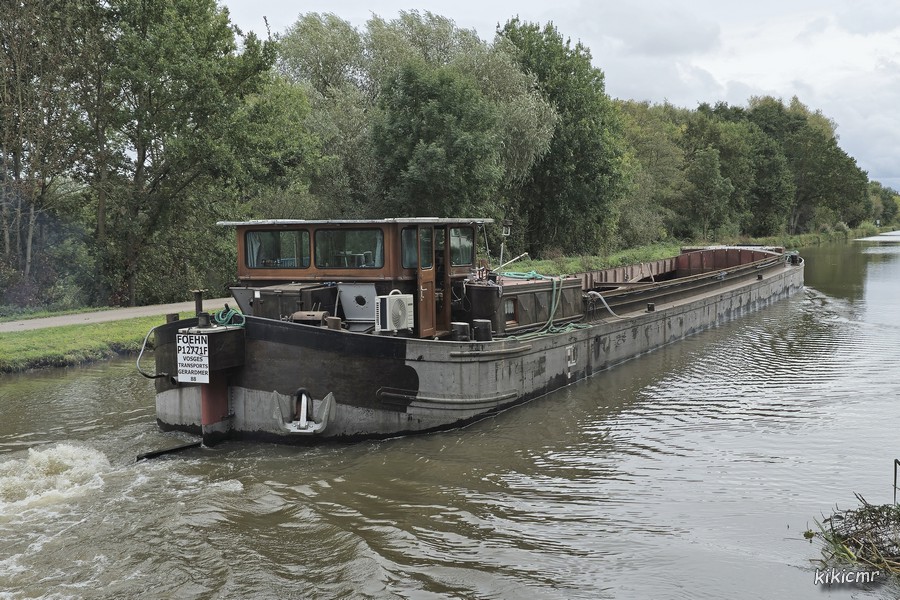 FOEHN car il a changé de devise ! Ça ne se voit pas encore de trop, mais c'est un contact chez VNF qui m'a dit que chez eux, il était annoncé sous ce nom ; alors j'ai épluché mes photos et effectivement, sur celle-ci prise depuis le pont à l'entrée du village de Mauvages, on peut voir que c'est écrit derrière la marquise, presque caché par un capot ouvert, à gauche :