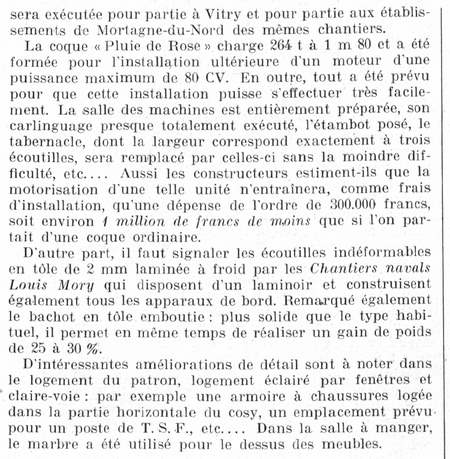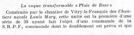 Maurice, Guy, il y aurait peut-être une petite modification à faire dans le titre du sujet, non ? Parce qu'en 1949, il s'appelait PLUIE DE ROSE quand il a été présenté au XVe Salon international des industries maritimes et fluviales, qui s'est tenu la première quinzaine d'octobre 1949 à Paris. "La navigation du Rhin - Revue de la navigation intérieure" d'octobre 1949 nous en parle, à l'époque il est qualifié de "coque transformable" :
