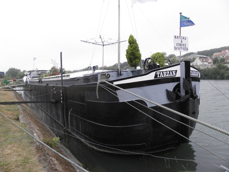Il est a vendre... mais attention, en canal il faut etre vigilent, il a le fer de poussage sur la quille avant, donc 15/20cms de plus, et des raquettes avec un coffre a l'arriere... donc a l'origine il est comme le Vagus, 39,21m, et la ??