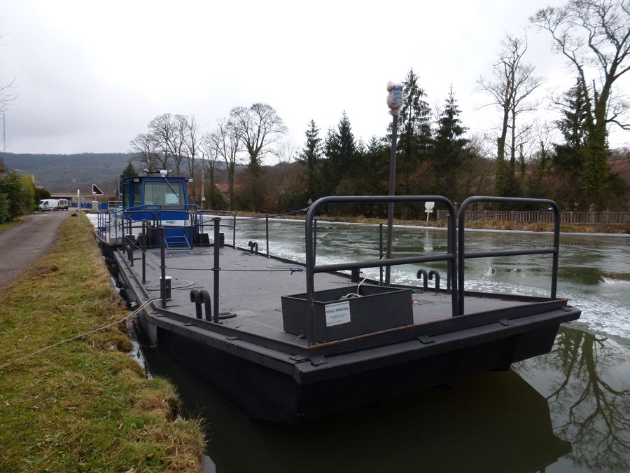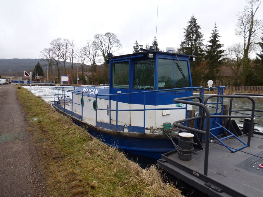 Les brise-glaces sont prêts... ici à Méréville (54), en amont de l'écluse 46, l'avant-dernière du canal des Vosges, versant Moselle, le pousseur :