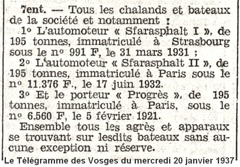 1° L'automoteur « SFARASPHALT I », de 195 tonnes, immatriculé à Strasbourg sous le n°991F, le 31 mars 1931 ;