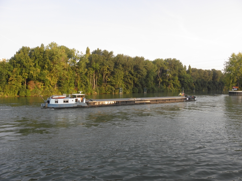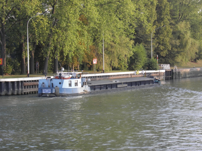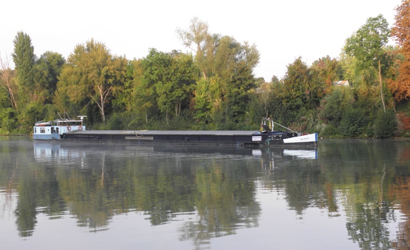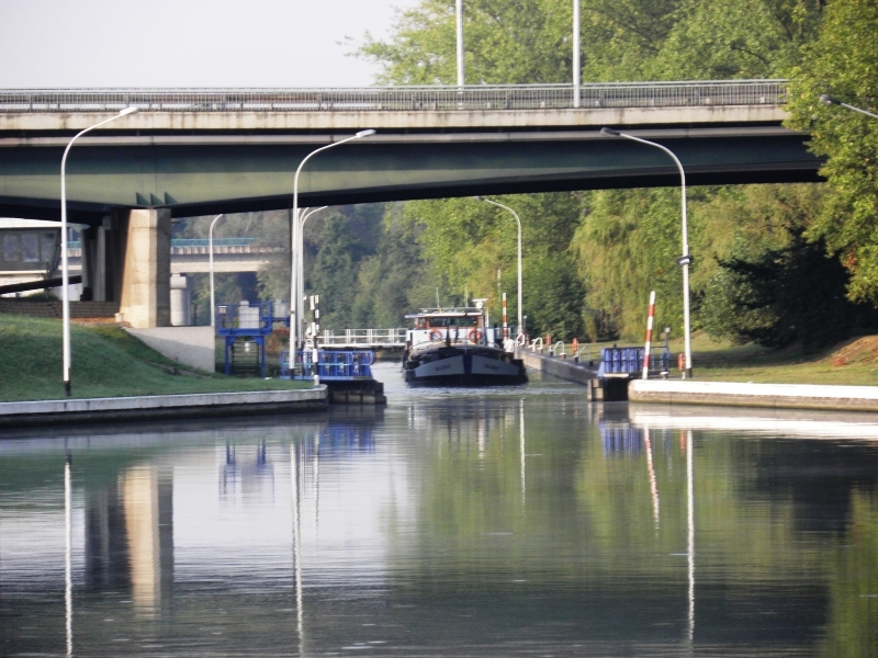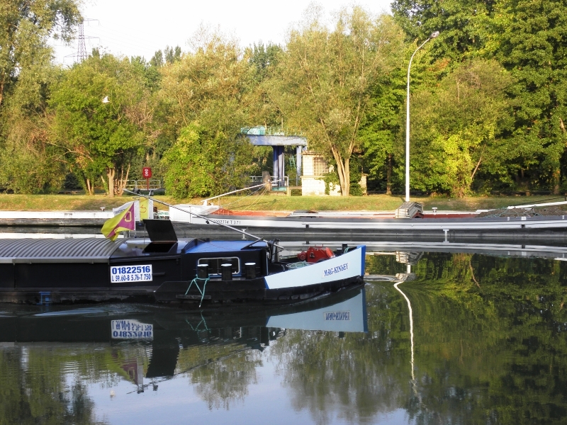 7h55, le pont de l'A15 est engage ! 7h56, je passe au dessus de l'ecluse de mon PK13 prefere... et j'apercois un bateau au loin immobile au milieu de l'Oise !!
