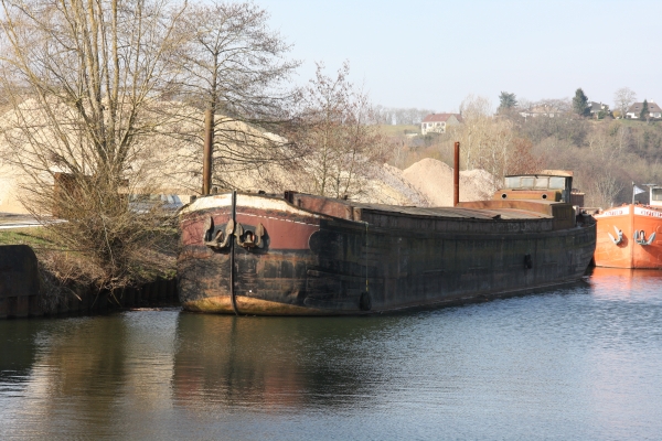 Est-ce que ce bateau est amarré sur la Moselle près d'un site d'entreposage de cailloux à une heure environ de Nancy en voiture?
