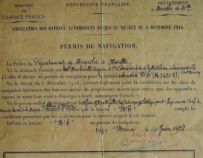 Voici son permis de navigation de juin 1928, on y lit qu'il est équipé d'un moteur Bulldog-Hill Diesel de 20/22cv à 2 cylindres :