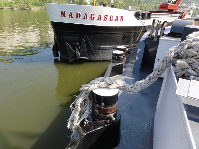 L'ingénieur du remorqueur prepare un gros corde qui dans l'evenement d'avarie a leur bride, va tomber par notre bord qu'ils puissent le récupérer facilement en mer avec un autre cable de remorquage attaché avec.